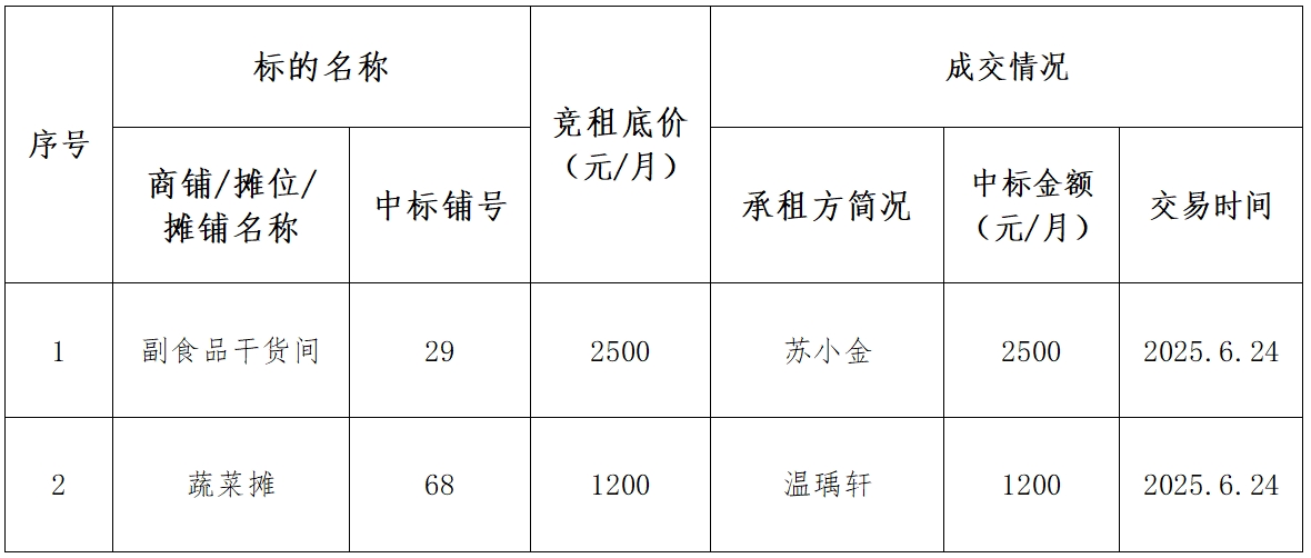 2025年6月24日現(xiàn)場公開競租城發(fā)悅居智慧市集(壹品望郡店)商鋪/攤位/攤鋪成交公示